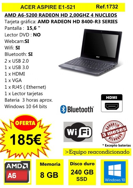 - Procesador AMD A6-5200 RADEON HD 2,00GHZ 4 NUCLEOS